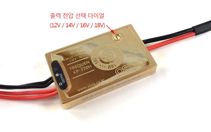 100% Made in KOREA! 대한민국 브랜드인 (주)아소아의 멀티콥터용 HV Type Compact Hyper Regulator KP-370H 75V까지 입력이 가능한 Ultra High Voltage 레귤레이터로서 출력 전압은 12V/14V/16V/18V 로 변경이 가능하며